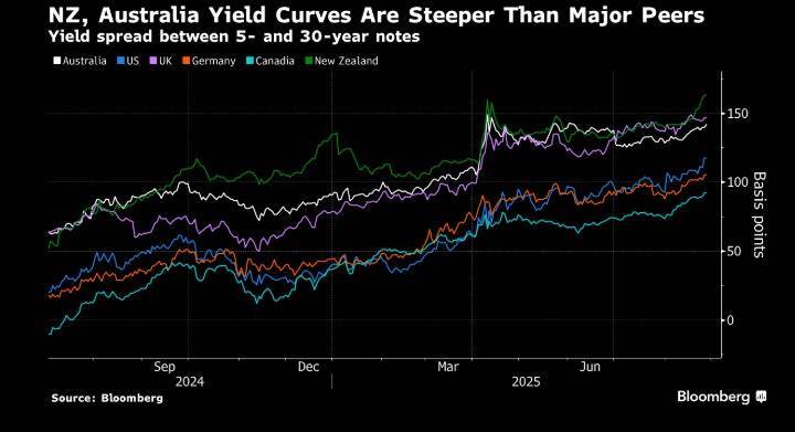 澳大利亚和新西兰的收益率曲线陡峭程度位居世界前列。央行释放的进一步降息信号稳定了短期债券收益率,而长期债券则因今年政府为弥补预算赤字增加债券发行承压。