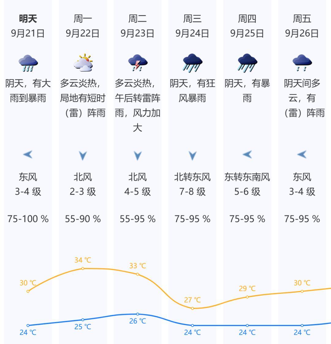 ▪ 受“米娜”残留云系影响,预计20日夜间至21日我市阴天,有大雨到暴雨,气温24-30℃。