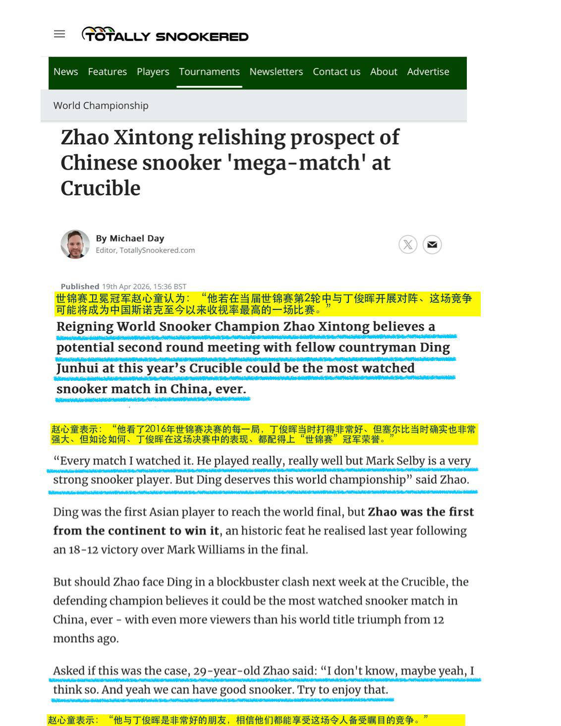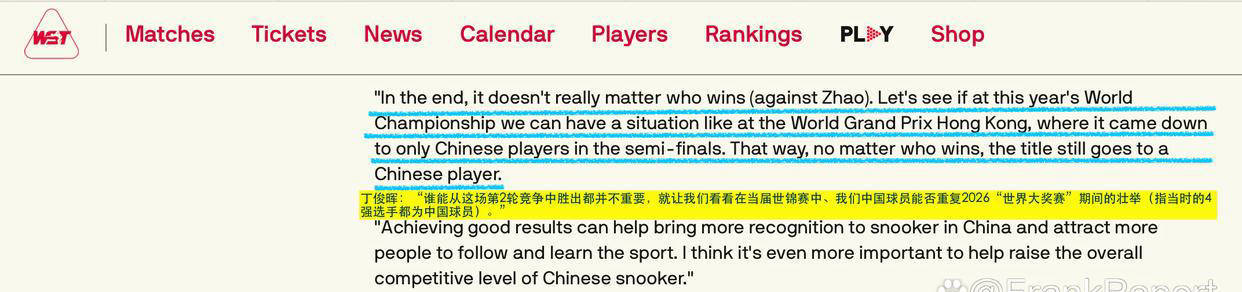 而卫冕冠军赵心童谈及可能迎来的对阵时表示,这场比赛极有可能成为中国斯诺克历史上收视率最高的赛事之一。他还高度评价了丁俊晖,赞道:“我看过2016年世锦赛的决赛,丁俊晖的表现完全配得上世锦赛冠军。”